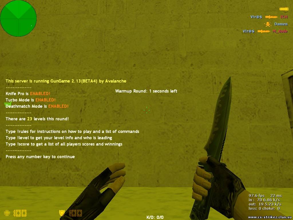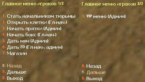 1) Убраны команды (say /dgl /awp /ak47 /m4a1) 2) Добавлено меню с выбором оружия 3) команда вызова меню say /vipmenu проще говоря пишем в чат /vipmenu 4) Запрещено брать за раунд сразу несколько оружий из меню 5) Брать оружие можно начиная с 3 го раунда 6) Гранаты и Броня теперь даются не всем админам а только с флагом T что из старого: 1) Надпись VIP в табе 2) Гранаты и Броня 3) motd окна /adminka and /vip